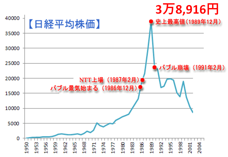東京23区の地価は、以前の7倍に到達し、株価も、1989年12月29日の年末大納会の時点で、日経平均株価38916円という、過去最高の価格に到達します。